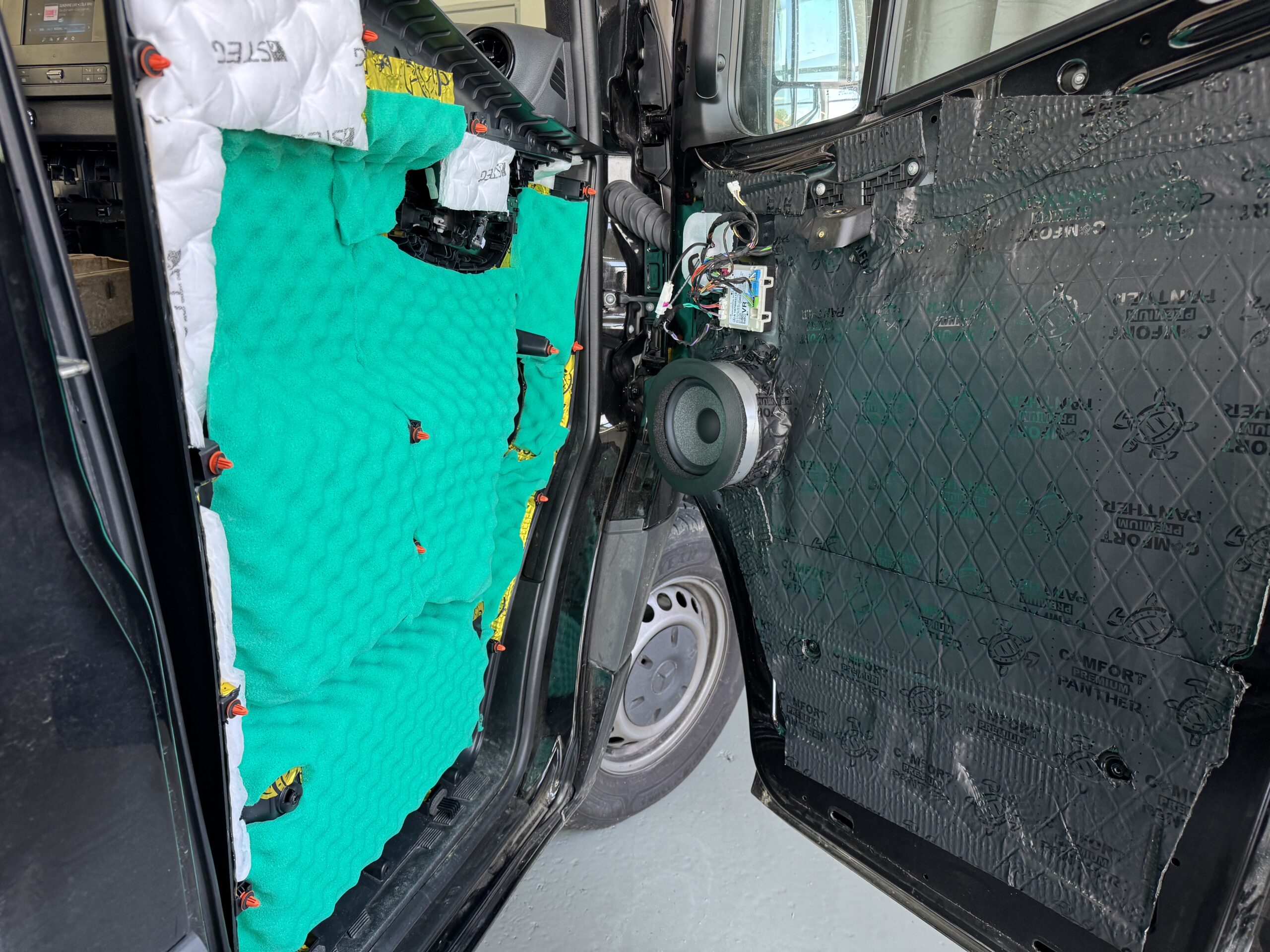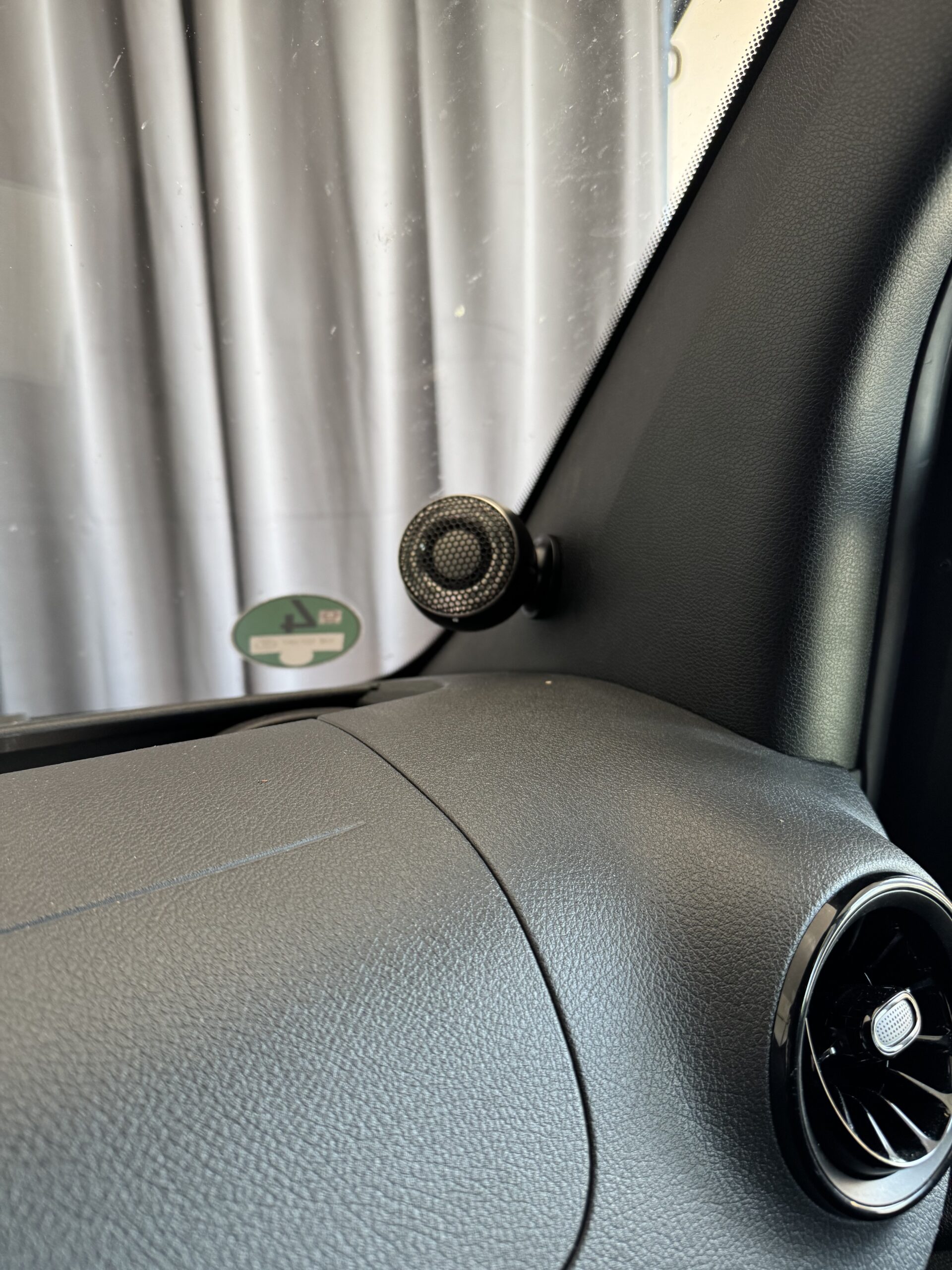Brax Hoch- und Mitteltöner, Helix Subwoofer und DSP-Verstärker. Comfortmats Dämmung. Bei diesem Sprinter haben wir nur hochwertigste Komponenten von Brax und Helix verbaut. Die Türen wurden massiv mit Comfortmats Alubutyl und Softwave gedämmt. Auf massiven Ringen wurden die Tiefmitteltöner von Brax befestigt. Die Hochtöner wurden in Kugelgehäusen an der A-Säule akustisch optimal ausgerichtet. Für die Beifahrersitzkonsole haben wir ein passendes Gehäuse angefertigt. In diesem sitzt der Helix Subwoofer. Hinter der Mittelkonsole wurde die hochwertige Helix 6 Kanal Endstufe mit integriertem DSP verbaut.